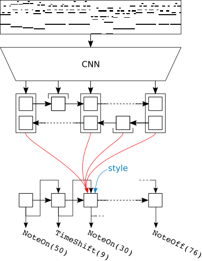 In short, the classical seq2seq model consists of an RNN encoder and an RNN decoder. The encoder computes an intermediate representation of the input sequence and the decoder then generates the output sequence based on this representation. The main difference between seq2seq and our model is that we do not input a sequence of tokens, but a piano roll (a binary matrix indicating which notes are active at each time); for this reason, we use a different encoder architecture, consisting of a convolutional network (CNN) followed by a recurrent network (RNN), instead of just an RNN. The decoder architecture is unchanged, except that we additionally provide the decoder RNN cell with an indication of the target style, as mentioned in the previous section.