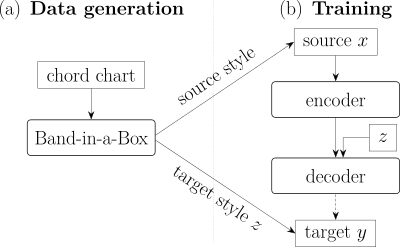 The model has an encoder-decoder architecture, with the encoder computing a style-independent representation and the decoder generating the output in a given target style (provided as an embedding vector \(z\)). The trick here is that there is one single encoder, shared for all the source styles. As you can hear from the examples, this was enough to make the model generalize to a wide range of different inputs, and even deal with inputs that include a melody (although the output is still only an accompaniment).